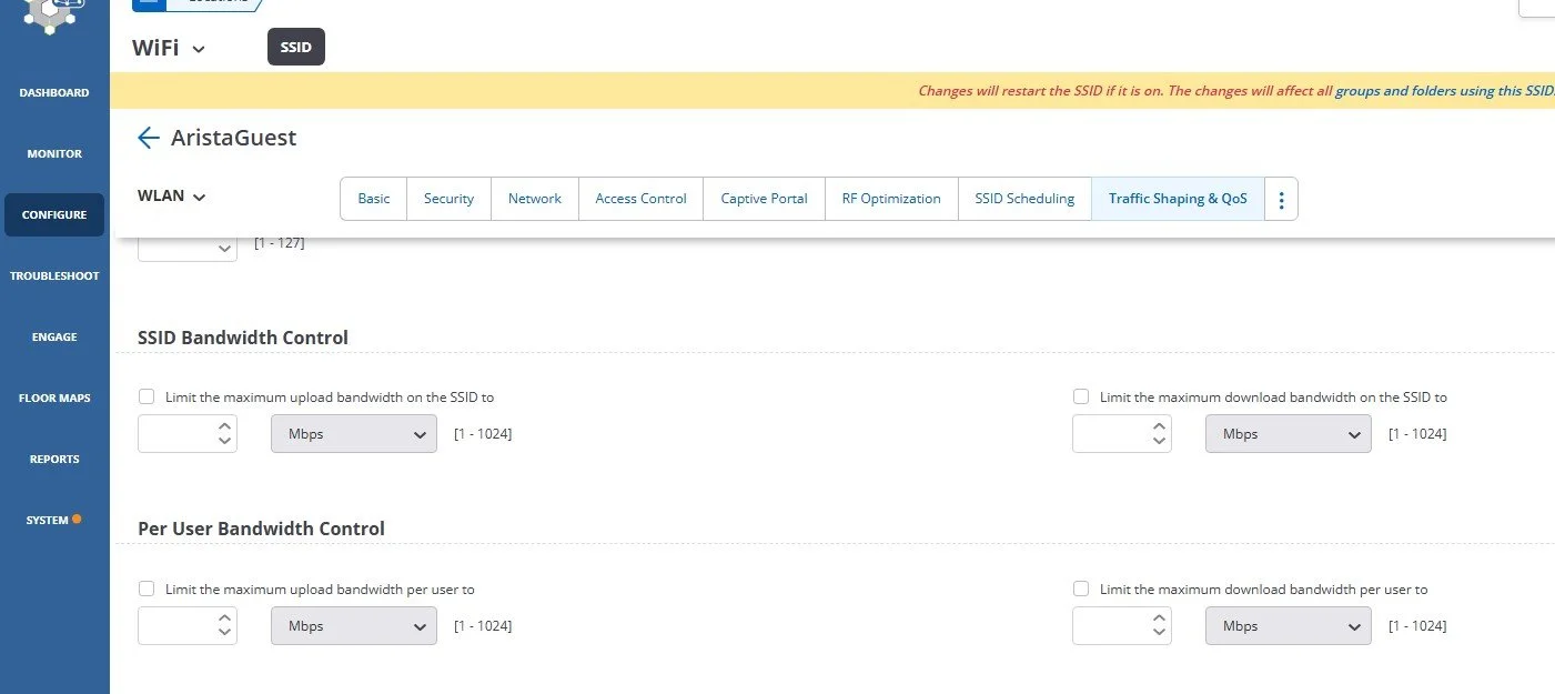 The number of Guest Users can fluctuate greatly, as well as the amount of bandwidth they will consume. The amount of bandwidth on your uplinks to the Internet will be consistent. A calculation on how much bandwidth the Guest network should consume is a value that needs to be calculated both upstream and downstream; and should be set accordingly. For further refinement, and to be fairer for all the Guest Users, per user settings can be implemented so that no single user monopolizes the bandwidth of the Guest Wireless Network: