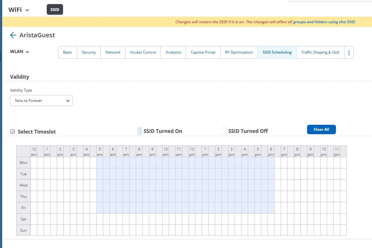 Having your Guest Wireless Network available after business hours entices its usage for reasons not intended or desired. It also allows access when your employees are no longer present to monitor the Guest Users and their activity.